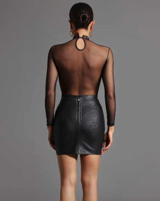 Body de encaje elegante con cuello alto y mangas largas. Un diseño refinado que realza la silueta y aporta un toque femenino y sofisticado, ideal para ocasiones especiales o para elevar cualquier look.